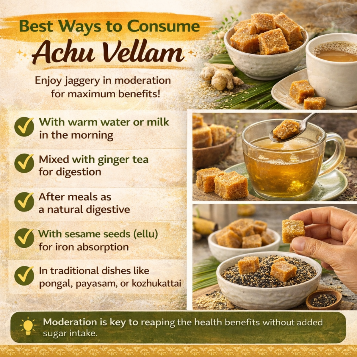 Looking for Achu Vellam recipes for diabetes or adding natural sweetner your meals? Try adding grated jaggery to your morning tea, smoothies, or porridge. You can even use it to make Achu Vellam health drinks or delicious Achu Vellam recipes like pongal, laddoo, and chakkarai pongal.