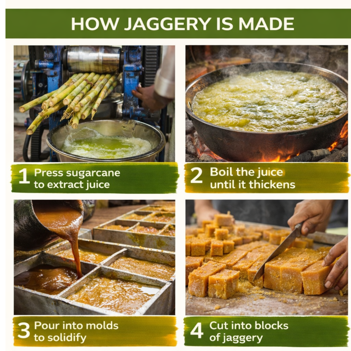 Boil fresh sugarcane juice slowly until it thickens into syrup, then pour it into moulds and let it cool into solid jaggery blocks. No chemicals—just pure, traditional sweetness.