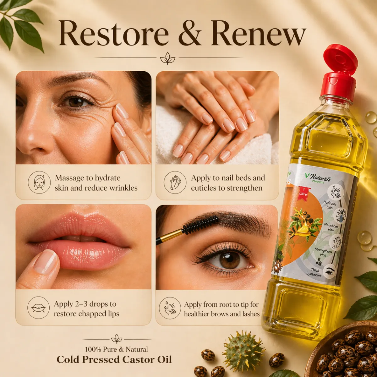 Massaging with warm castor oil enhances blood circulation, relieves sore muscles, and promotes lymphatic drainage. Many people use it as a carrier oil for essential oils in aromatherapy, making it a powerful wellness tool for relaxation and rejuvenation.