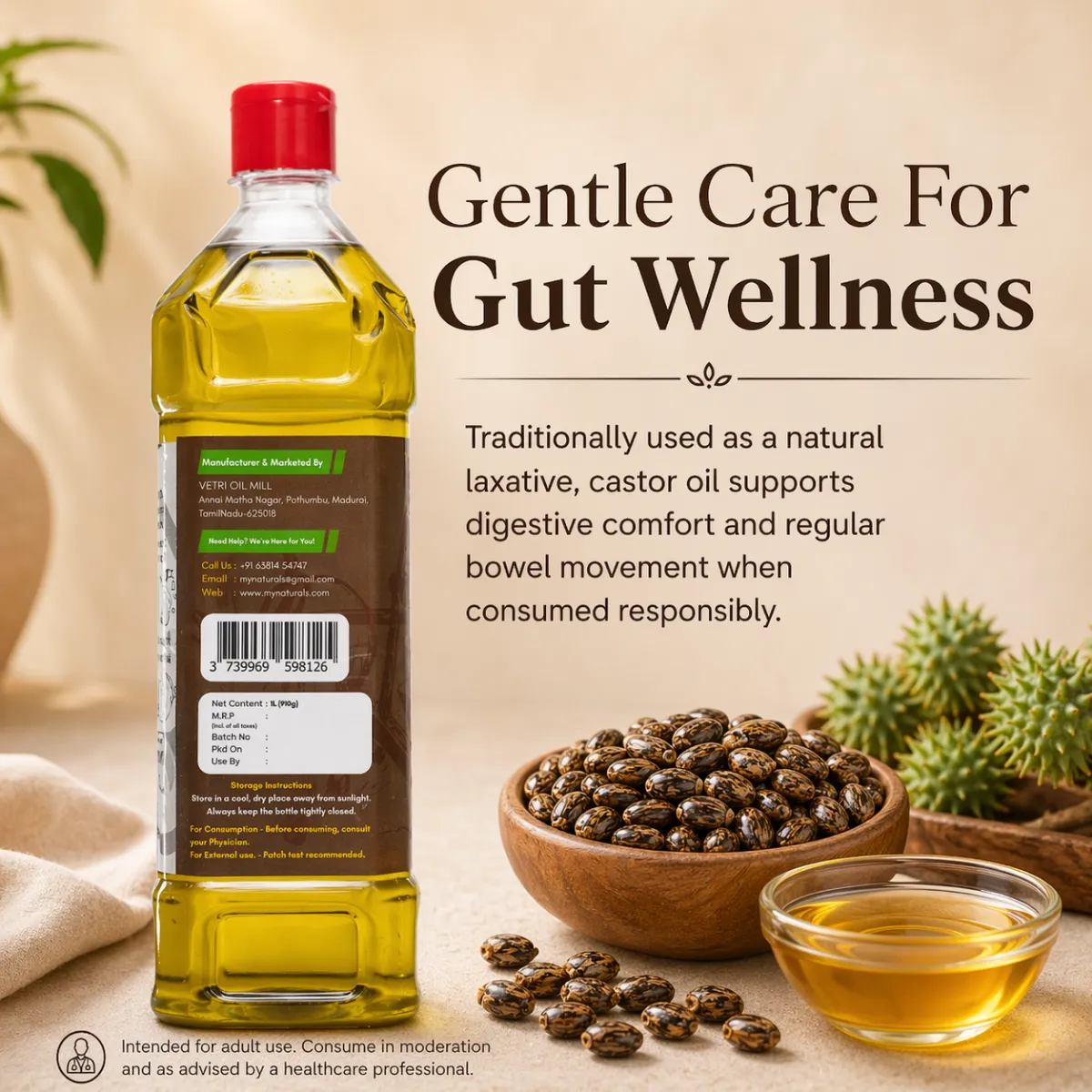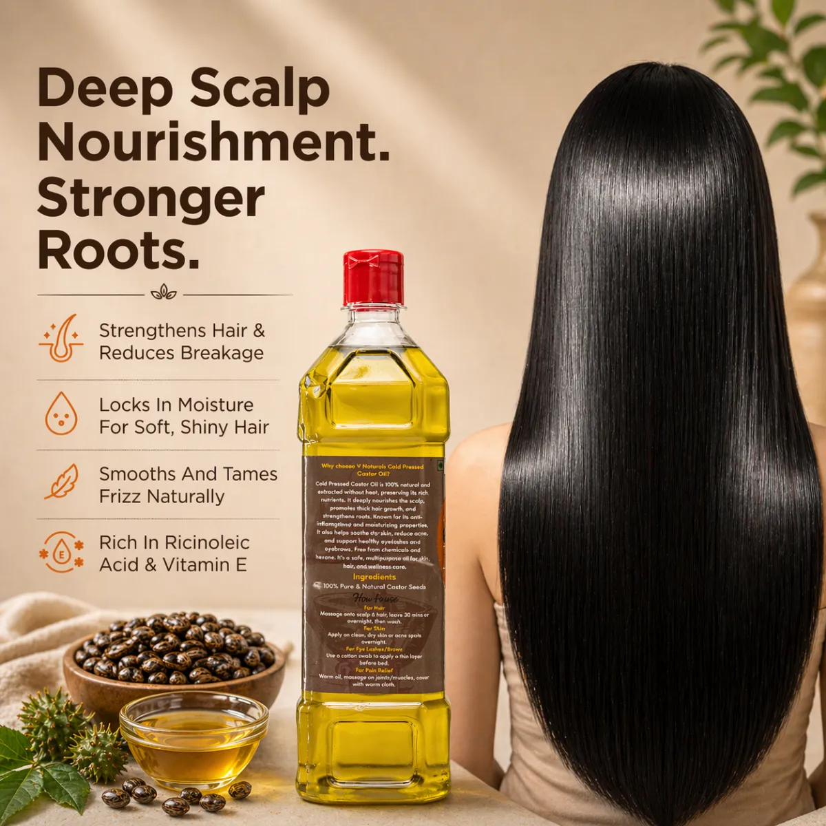 Our castor oil is cold-pressed to preserve its purity and potency. Unlike refined oils, cold-pressing ensures that no nutrients are lost in the process. The seeds are carefully cleaned, pressed at low temperatures, and filtered to deliver 100% pure, hexane-free castor oil—rich in ricinoleic acid, omega fatty acids, vitamin E, and proteins.