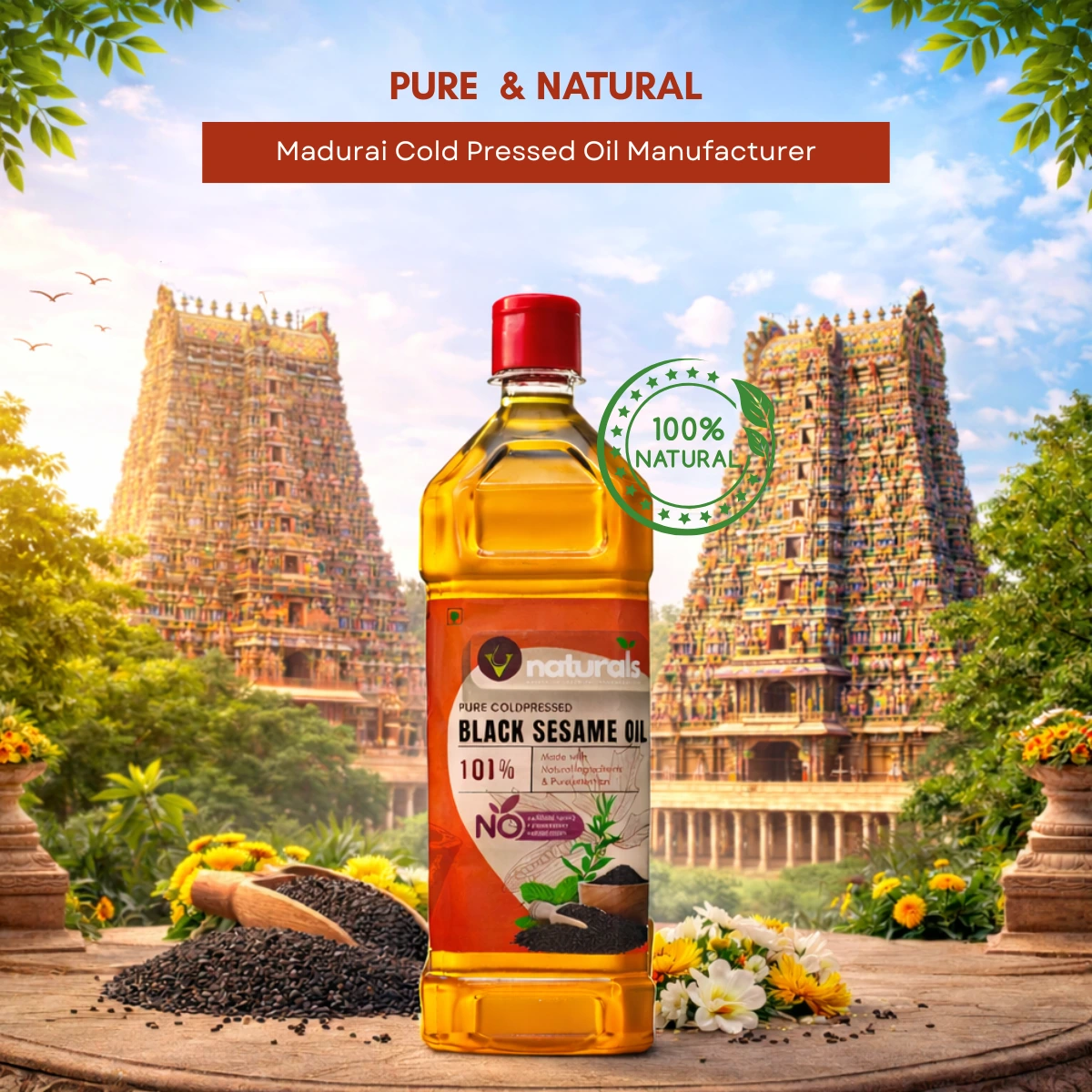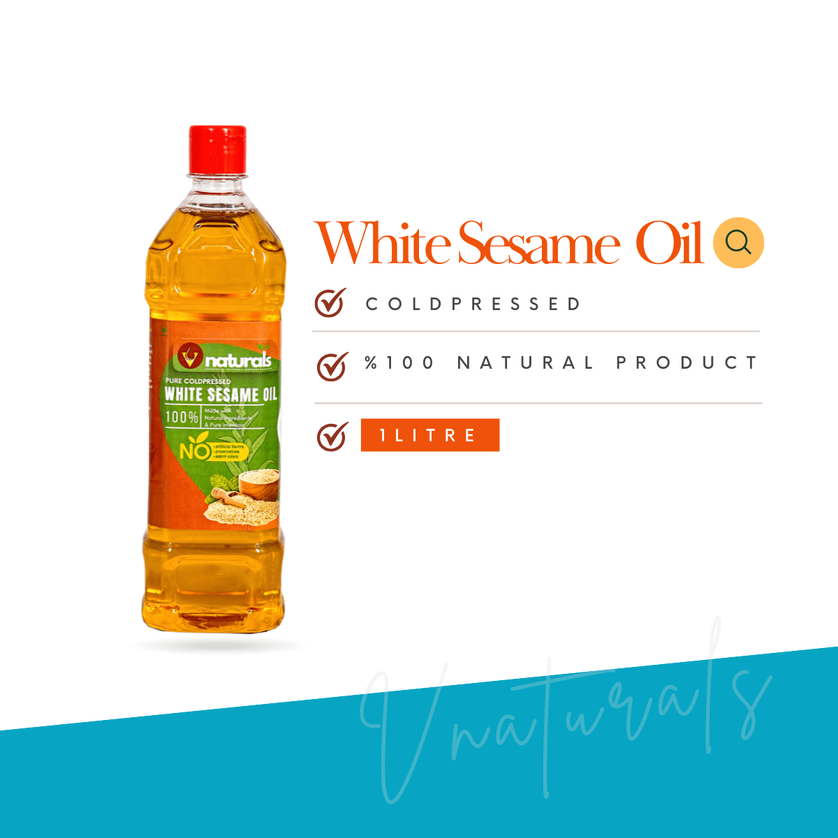 Discover the natural goodness of Cold Pressed White Sesame Oil by V Naturals. Extracted using the traditional wooden chekku (ghani) method, this oil retains its nutrients, aroma, and authentic taste. Ideal for cooking, baby massage, Ayurveda, skincare, and hair care, it is 100% pure, chemical-free, and FSSAI certified.